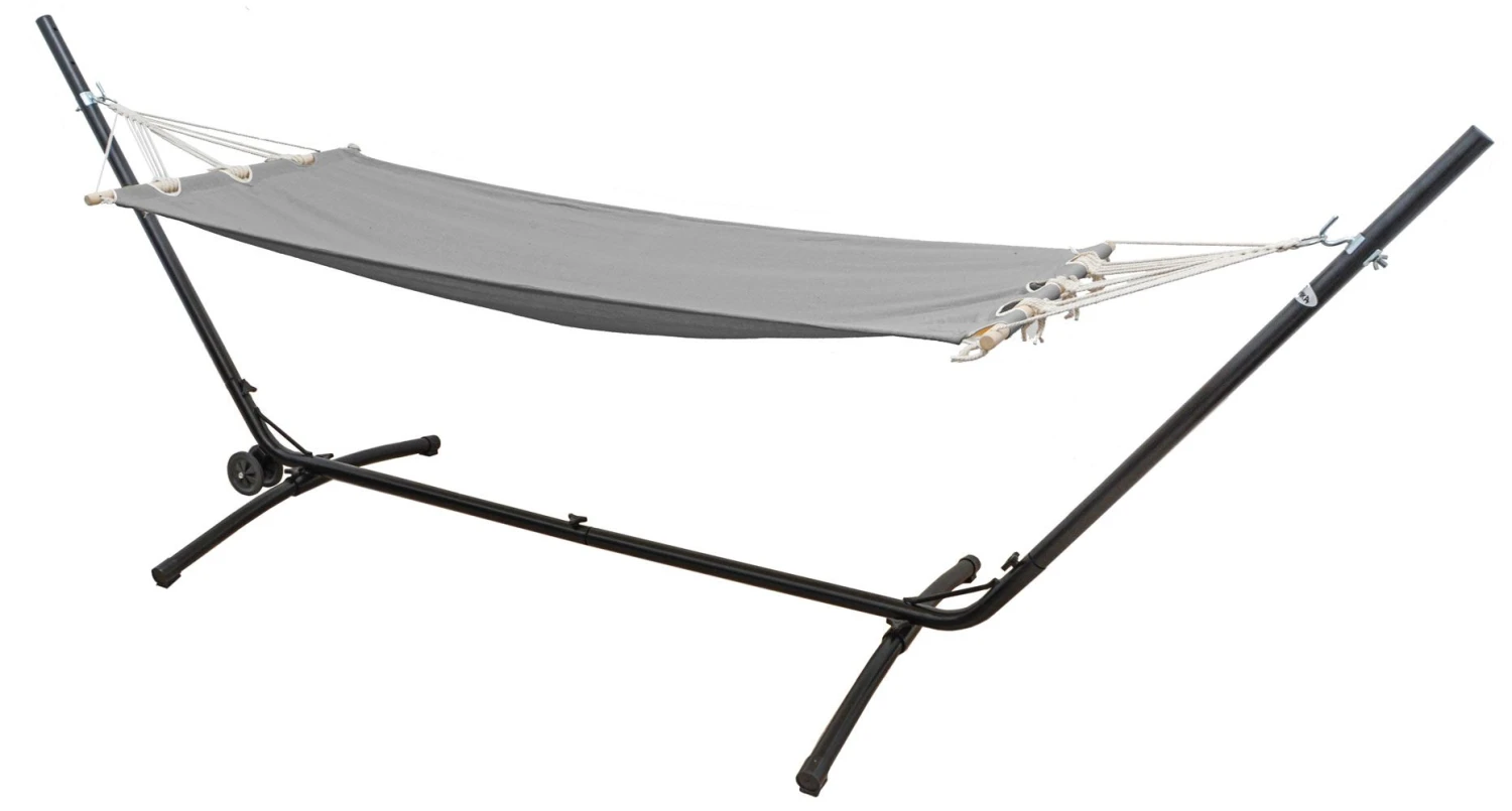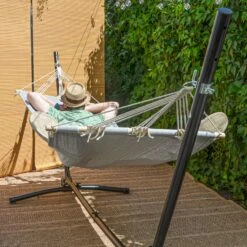 De hangmatstandaard wordt in elkaar gezet en bevestigd met de meegeleverde