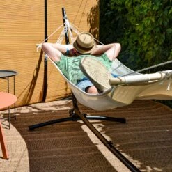 De hangmatstandaard wordt in elkaar gezet en bevestigd met de meegeleverde