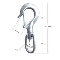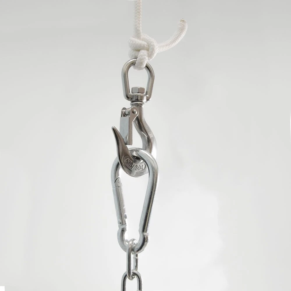 Dat is genoeg voor een hangstoel, bokszak, plafondschommel, draaigrill – en al het andere dat je onder het plafond wilt bevestigen. De draaibare beugel voorkomt dat het touw of de ketting verdraait. De draaibare karabijnhaak beschermt tegen slijtage, de beugel wordt minder belast en de plafondhaak draait niet vanzelf uit.
