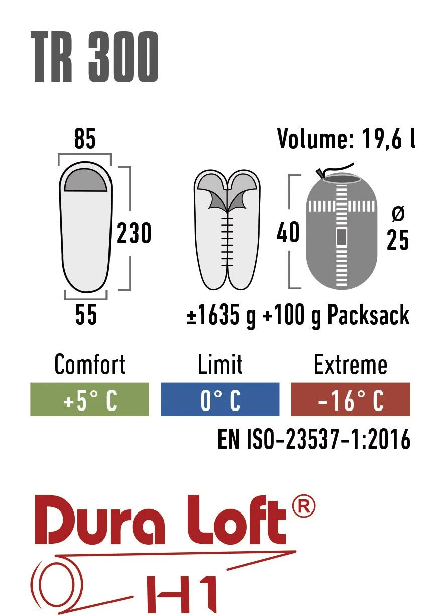 De regelbare capuchon en thermische kraag voorkomen warmteverlies en bieden meer comfort. De extra lange tweeweg rits tot aan het voeteinde is aan twee zijden te openen voor extra ventilatie en bewegingsvrijheid; ideaal tijdens een warmere nacht. De anti-tochtstrook maakt de ritssluiting winddicht. Het anti-klemsysteem verhindert het vastlopen van de rits in de stof. De ritssluiting heeft een ergonomische ritstrekker. De slaapzak beschikt ook nog over een handige binnenzak aan de binnenkant met velcro-sluiting. De slaapzak wordt geleverd in een handige opberghoes met compressieriemen om de slaapzak nog compacter mee te nemen. Maximale lichaamslengte: 200 cm. Kan in de wasmachine op 30 °C.