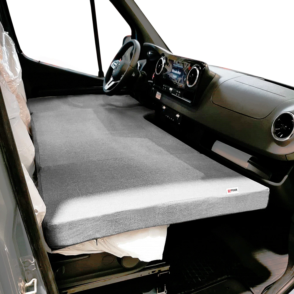 Opvouwbaar campermatras samengesteld uit 7 centimeter HR-schuim van 25 kg/m3 met een stevige dichtheid en een MDF-plaat van 1 cm als basis om de scheiding tussen de zitplaatsen te ondersteunen en zo het bed waterpas te stellen.