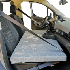 Het camperbed voor is zeer eenvoudig te monteren, u hoeft het bed alleen maar uit te klappen, bij voorkeur in de bijrijdersruimte, uit te schuiven en zodra het op zijn plaats staat, de voorstoelen te verschuiven door het bed tegen het dashboard te drukken. Plaats ten slotte de veiligheidsgordel in de bijrijdersruimte om de weerstand ervan te verbeteren.