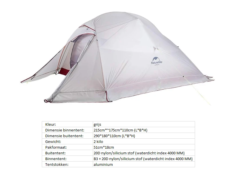 De Cloud Up 3, 4-seizoenen tent van Naturehike komt met een extra sneewdoek, waardoor je deze tent gedurende het hele jaar kunt gebruiken! De 20D nylon/silicium stof van de buitentent biedt een waterkolom van maar liefst 4000mm. Hiermee zit je dus gegarandeerd droog bij een hevige regenbui. Daarnaast is dit een echte lichtgewicht tent (slechts ~2 kilo!) met een compact pakformaat in je backpack. Gemakkelijk mee te nemen dus! Kortom een kwalitatief uitstekende tent voor al je outdoor activiteiten! Liever een maatje kleiner? Zie ook onze upgraded Cloud Up 1 tent (3-seizoenen) en upgraded Cloud Up 2 tent!