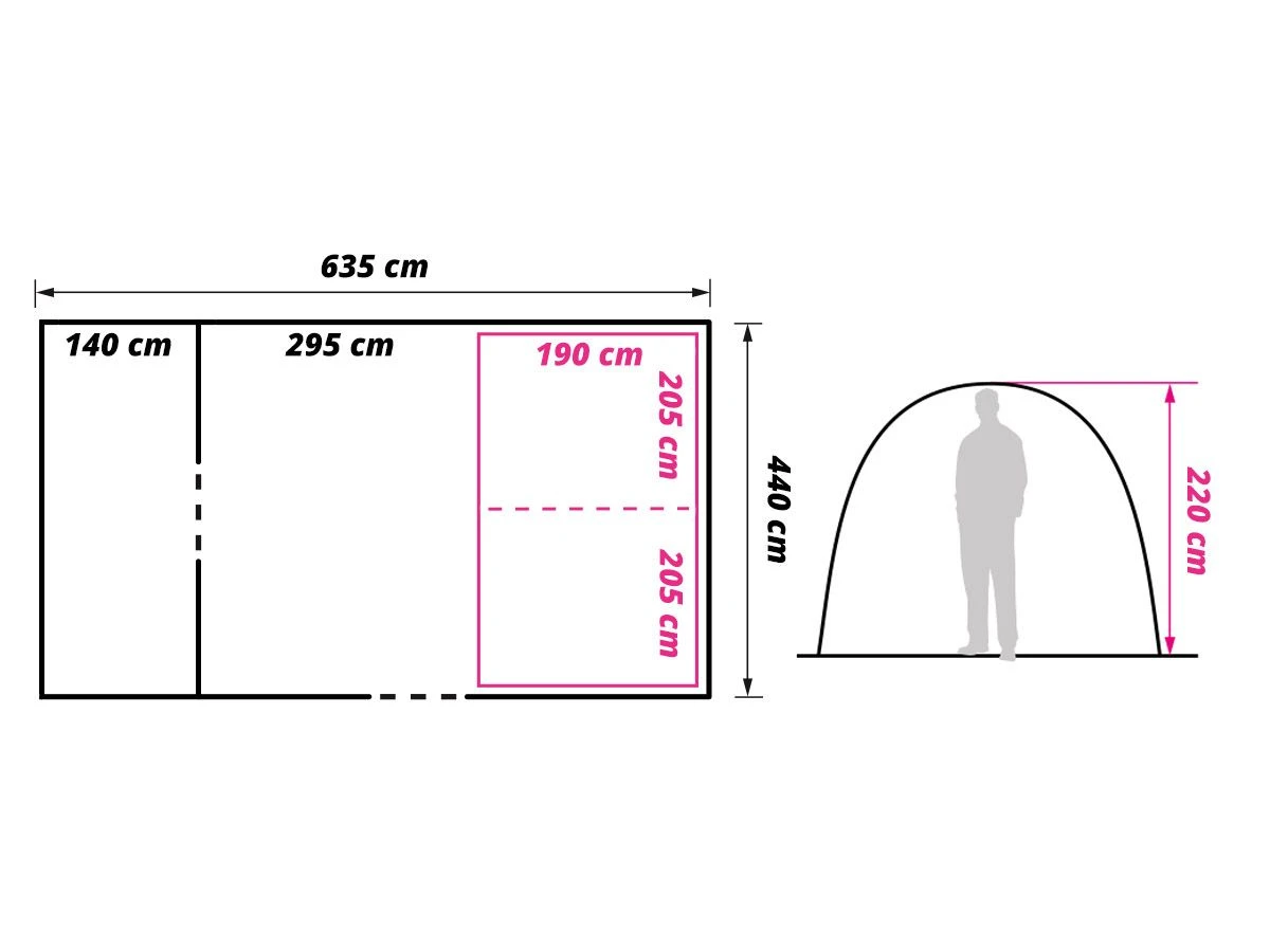 De slaapcabine van de Obelink Dallas 6 XL is deelbaar. Dat wil zeggen dat je flexibel bent qua indeling. Dankzij de oprolbare tussenwand kun je zelf kiezen of je gaat voor twee slaapgedeeltes van 205 x 190 centimeter of één grote cabine van 410 x 190 centimeter.