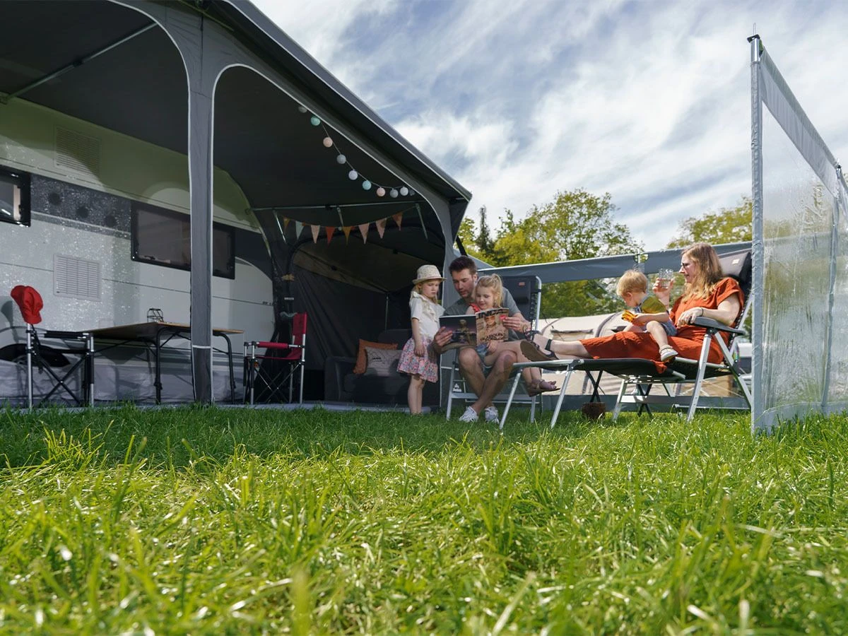 Dankzij de stalen staanders en dakliggers met een diameter van 19 mm en de stalen dwarspoten kun je het windscherm met de meegeleverde haringen en scheerlijnen stabiel neerzetten en afspannen.
