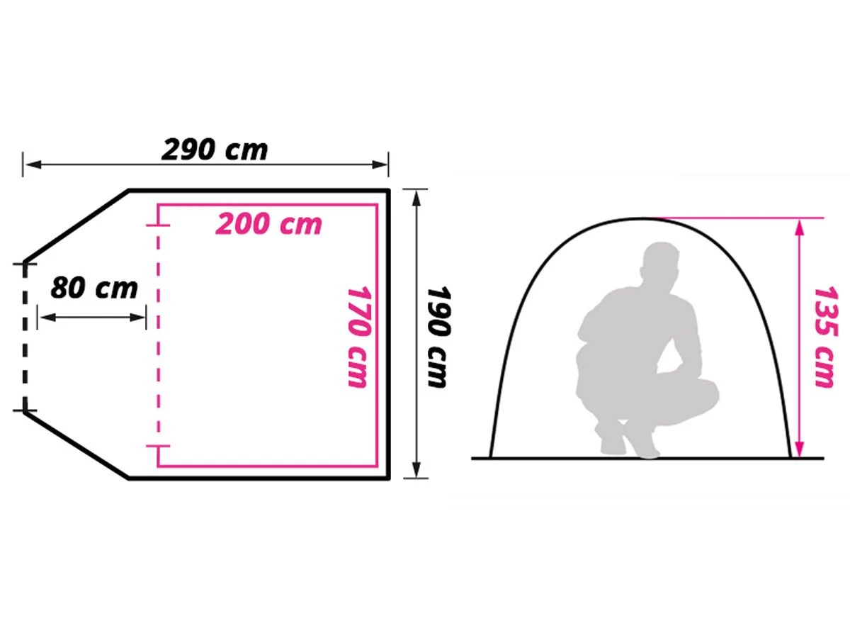 Het grondzeil met opstaande rand zorgt ervoor dat er tijdens regenval geen regenwater naar binnen loopt zodat je voeten en spullen droog blijven. De voorste tentstok is in de nok voorzien van een knik en zorgt voor meer hoogte bij de ingang, zo kun je de tent makkelijker betreden.