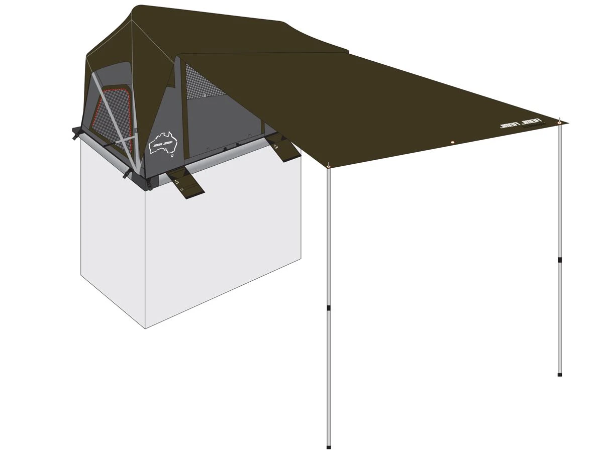 De Classic luifel voor de Jimba Jimba serie van Sheepie is een veelzijdige zonneluifel die zorgt voor extra beschutting van je Jimba Jimba daktent. Deze luifel die veel weg heeft van een tarp wordt inclusief twee telescopische luifelstaanders, haringen en scheerlijnen geleverd. Gebruik de Jimba Jimba Classic luifel om een overdekt zitje te creëren o gebruik hem om bij regen droog in en uit je Jimba Jimba te stappen.