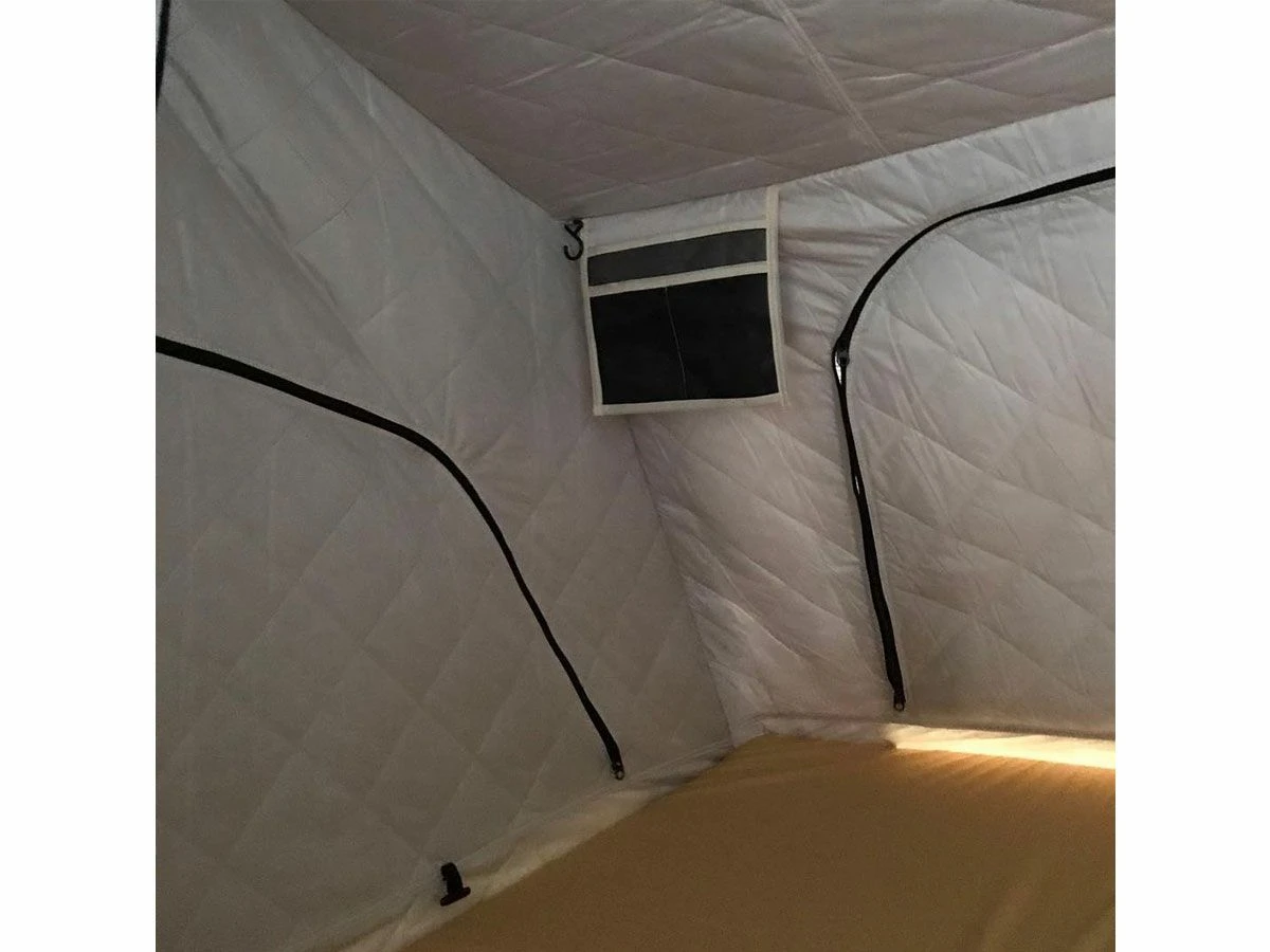 De thermo binnentent wordt met klittenband bevestigd aan de binnenzijde van de daktent en kan blijven zitten wanneer deze ingeklapt is.
