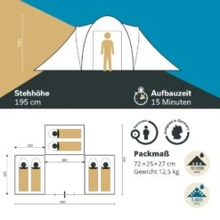 Met een comfortabele stahoogte van 195 cm, veel ruimte in het woongedeelte voor bagage en vrienden en drie binnententen voor een verkwikkende nachtrust.