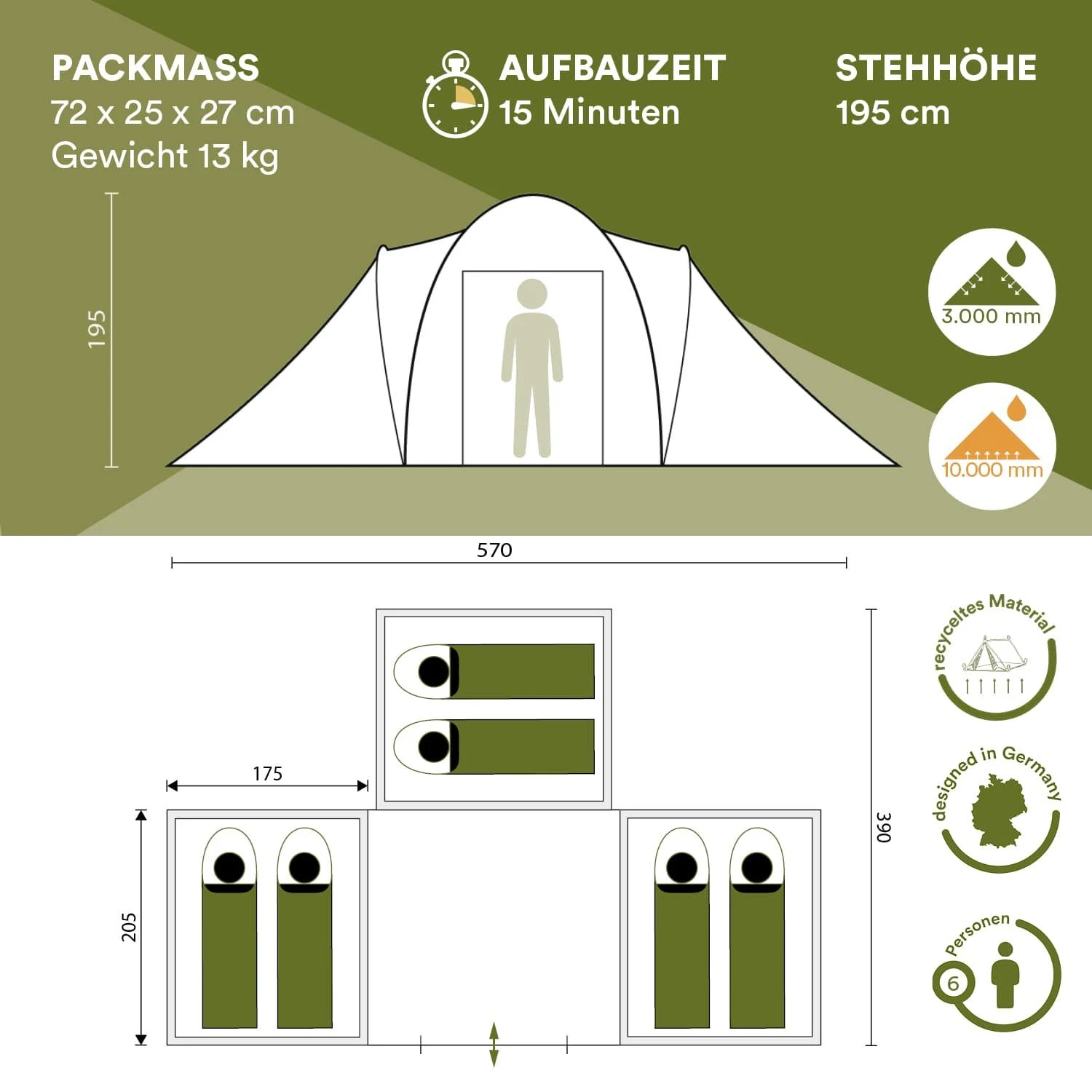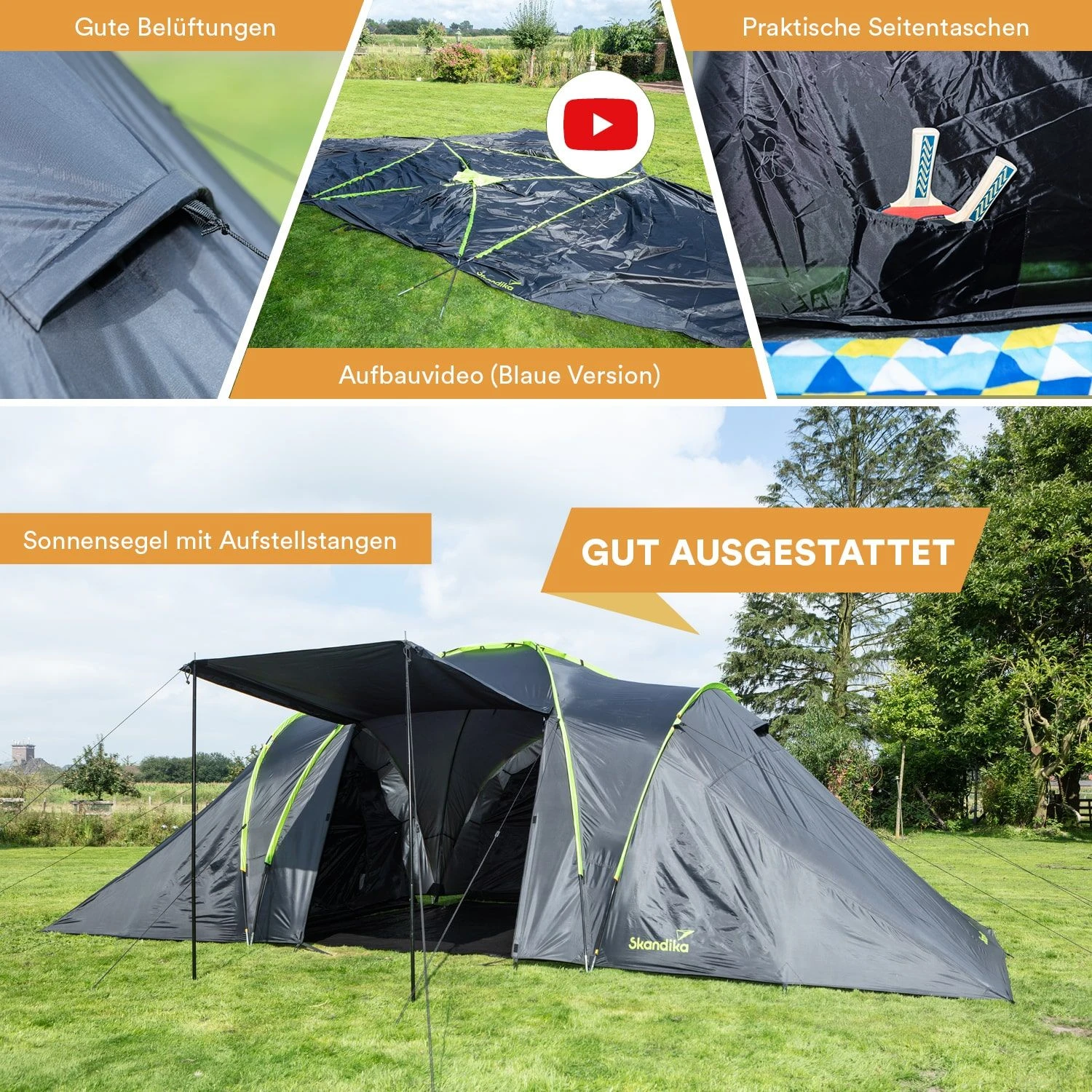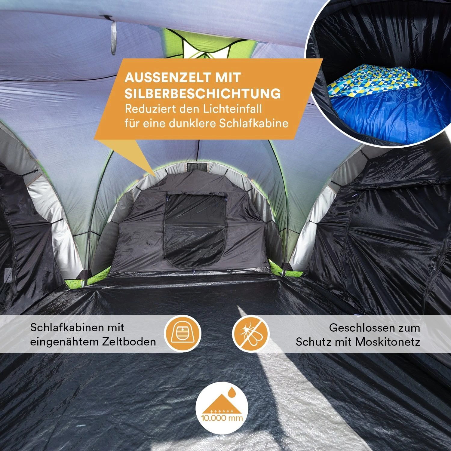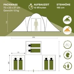 Grote familietent met veel functionele extra’s zoals lampophanging, kabelopening, organiserzakken, ventilatieopeningen en een ingang die als zonneluifel kan worden gebruikt.