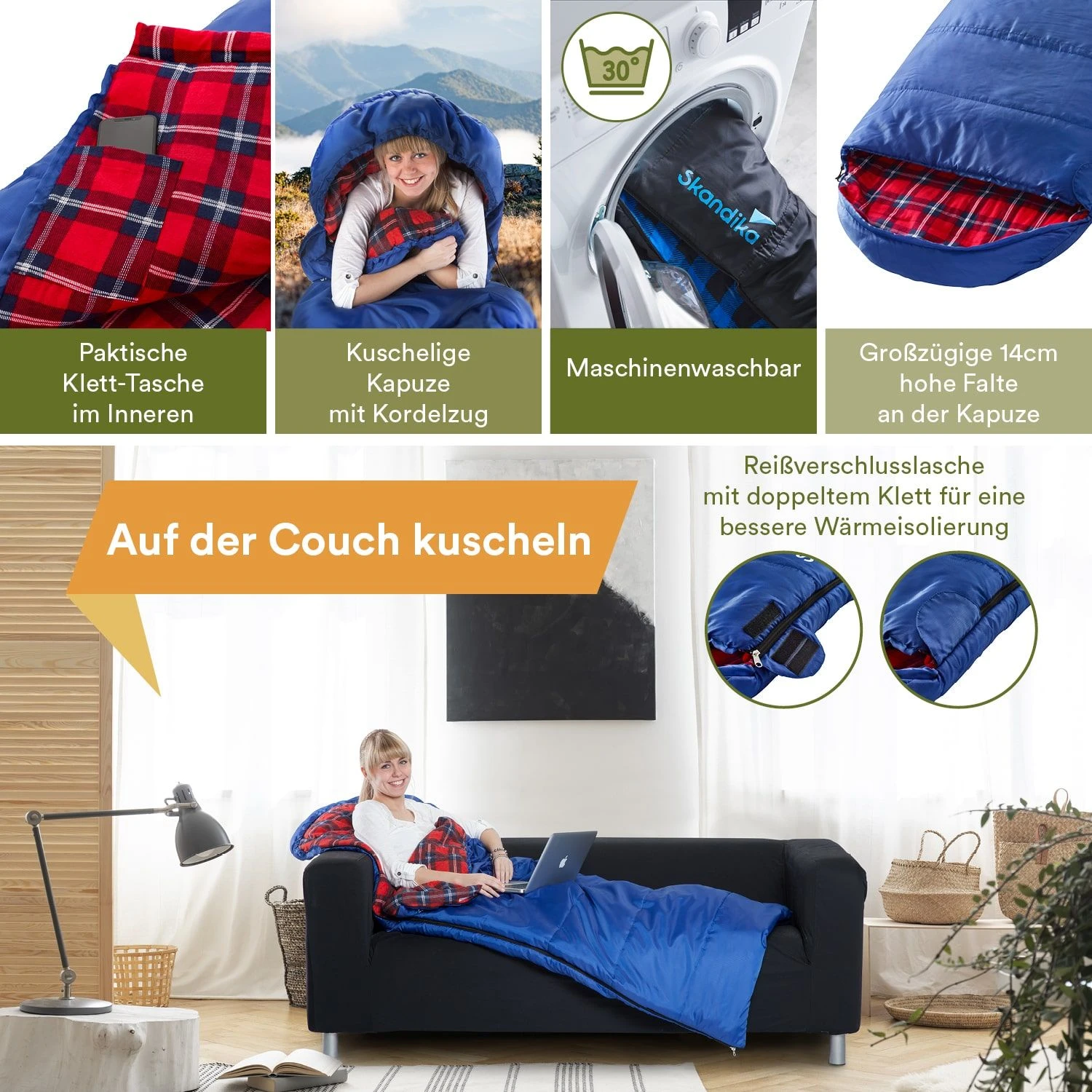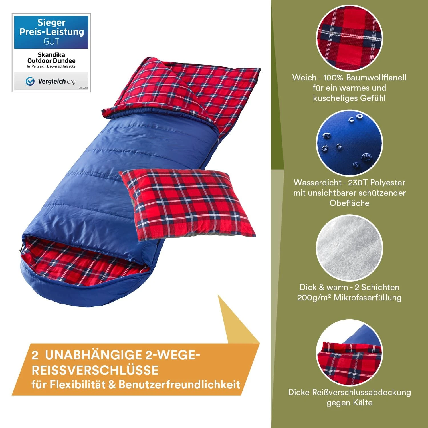 De DUNDEE is onze topkwaliteit slaapzak in de vorm van een deken: de perfecte slaapzak als je waarde hecht aan je bewegingsvrijheid ’s nachts en houdt van het comfort van een zachte katoenen molton. De rechte, rechthoekige vorm biedt veel ruimte in het bovenste deel van de schouders en aan het voeteneind, en toch heeft de DUNDEE niet ingeboet aan de voordelen van een knus hoofdgedeelte – zoals bij een mummieslaapzak. Dankzij het hoogwaardige buiten- en vulmateriaal houdt deze slaapzak je lekker warm – ook bij iets lagere temperaturen. Met zijn behaaglijk zachte 100% katoenen flanellen voering en vriendelijke design zal de DUNDEE het allround aantrekkelijke accessoire in je kampeeruitrusting zijn. Hij is verkrijgbaar met de ritssluiting links of rechts. Dit betekent dat 2 slaapzakken aan elkaar gekoppeld kunnen worden.