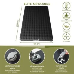 Met zijn 200 x 135 cm is de Elite Air Single opblaasbare slaapmat perfect voor een persoon met een gebruikersgewicht tot 200 kg en biedt hij veel ruimte dankzij zijn rechthoekige vorm.