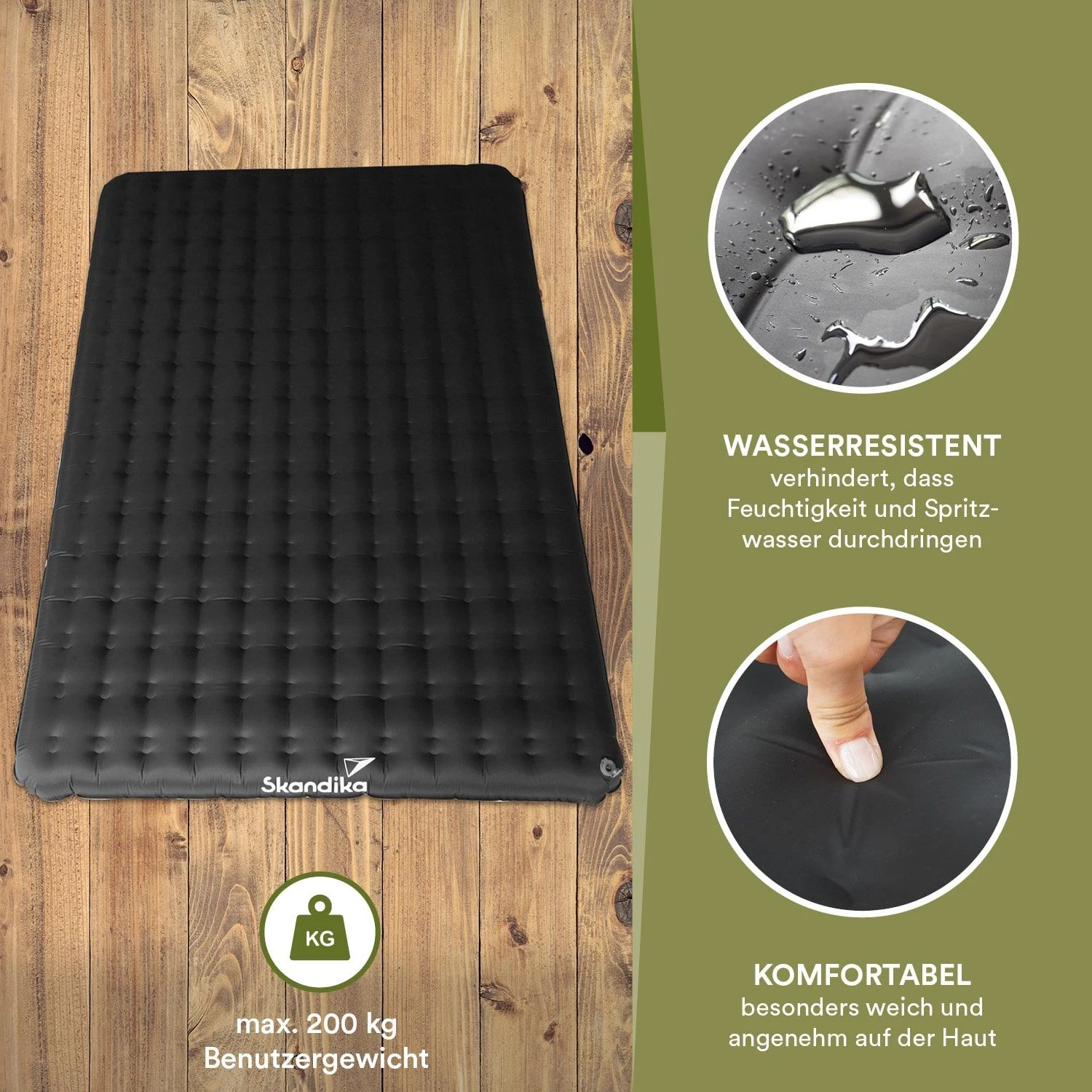 De slaapmat van de Skandika Air serie kan worden samengedrukt tot slechts 28 x Ø 14 cm en is superlicht met een gewicht van 1 kg. Hierdoor past de mat zelfs in een kleine trekkingrugzak of fietstas.