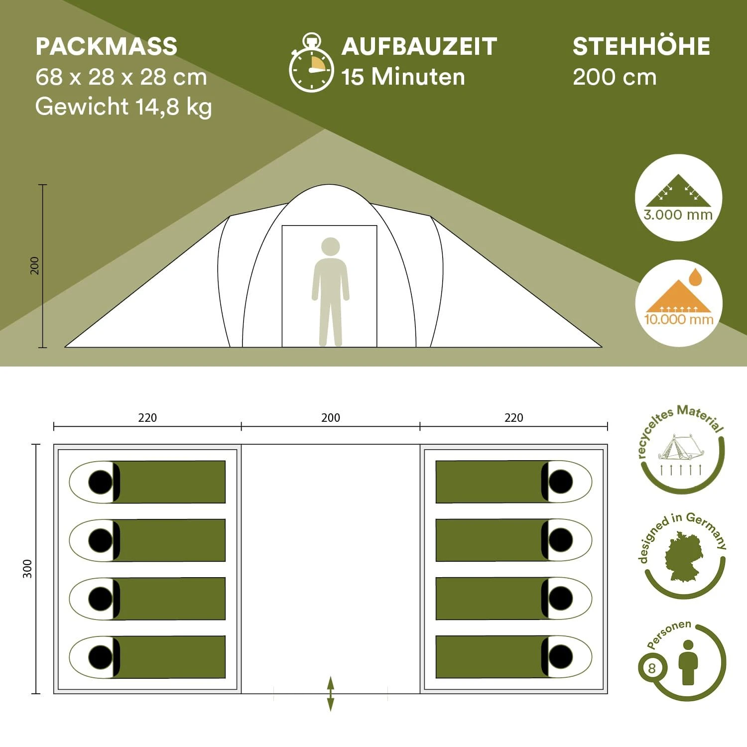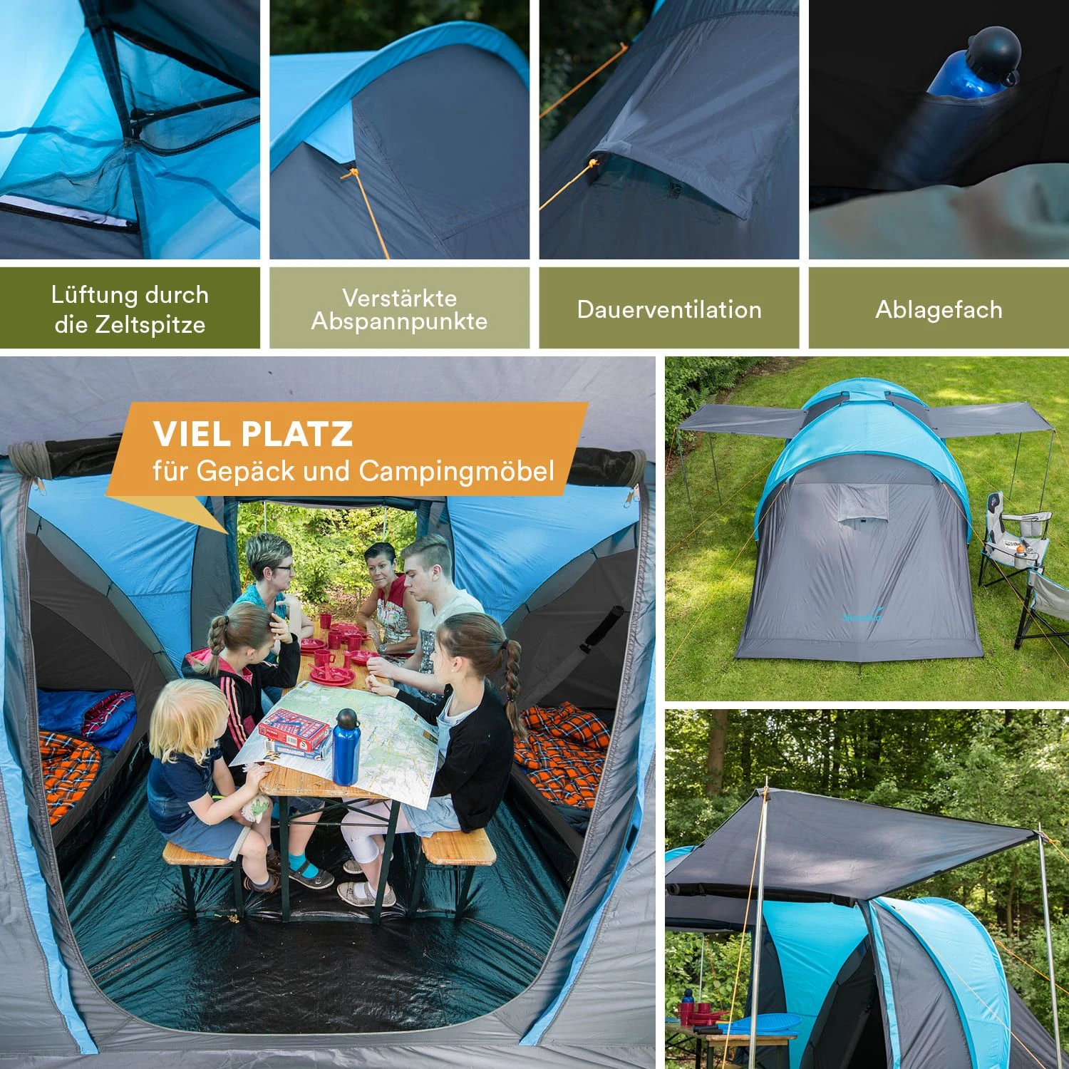 De twee slaapcabines aan weerszijden van de tent zorgen voor voldoende privacy, en het centraal geplaatste leefgedeelte biedt genoeg ruimte om comfortabel samen te eten en te ontspannen op dagen met slecht weer.