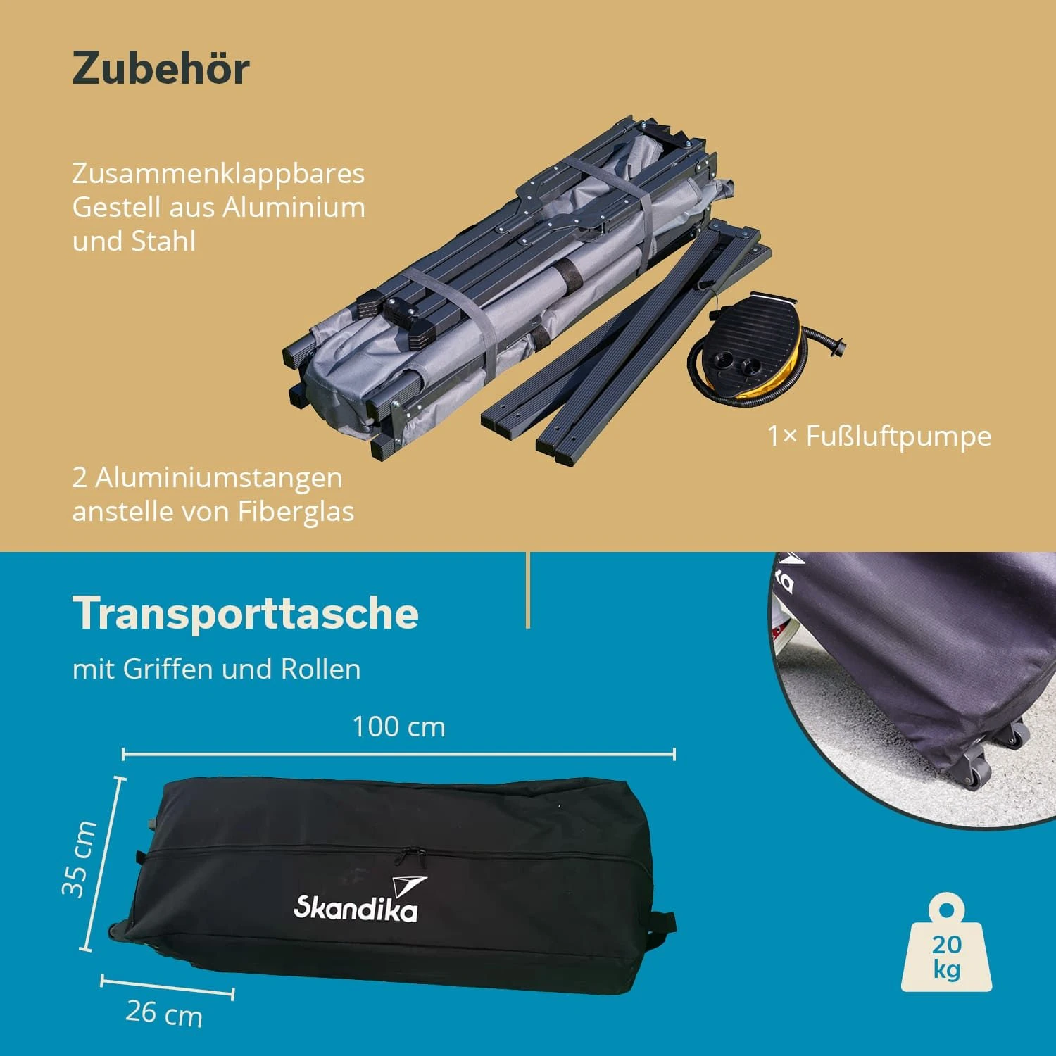 Het tentbed wordt geleverd in een slijtvaste tas met wieltjes en handvat, zodat alles stofvrij kan worden opgeborgen en gemakkelijk kan worden vervoerd. Een zachte hoes en een voetpomp zijn inbegrepen voor de matras.