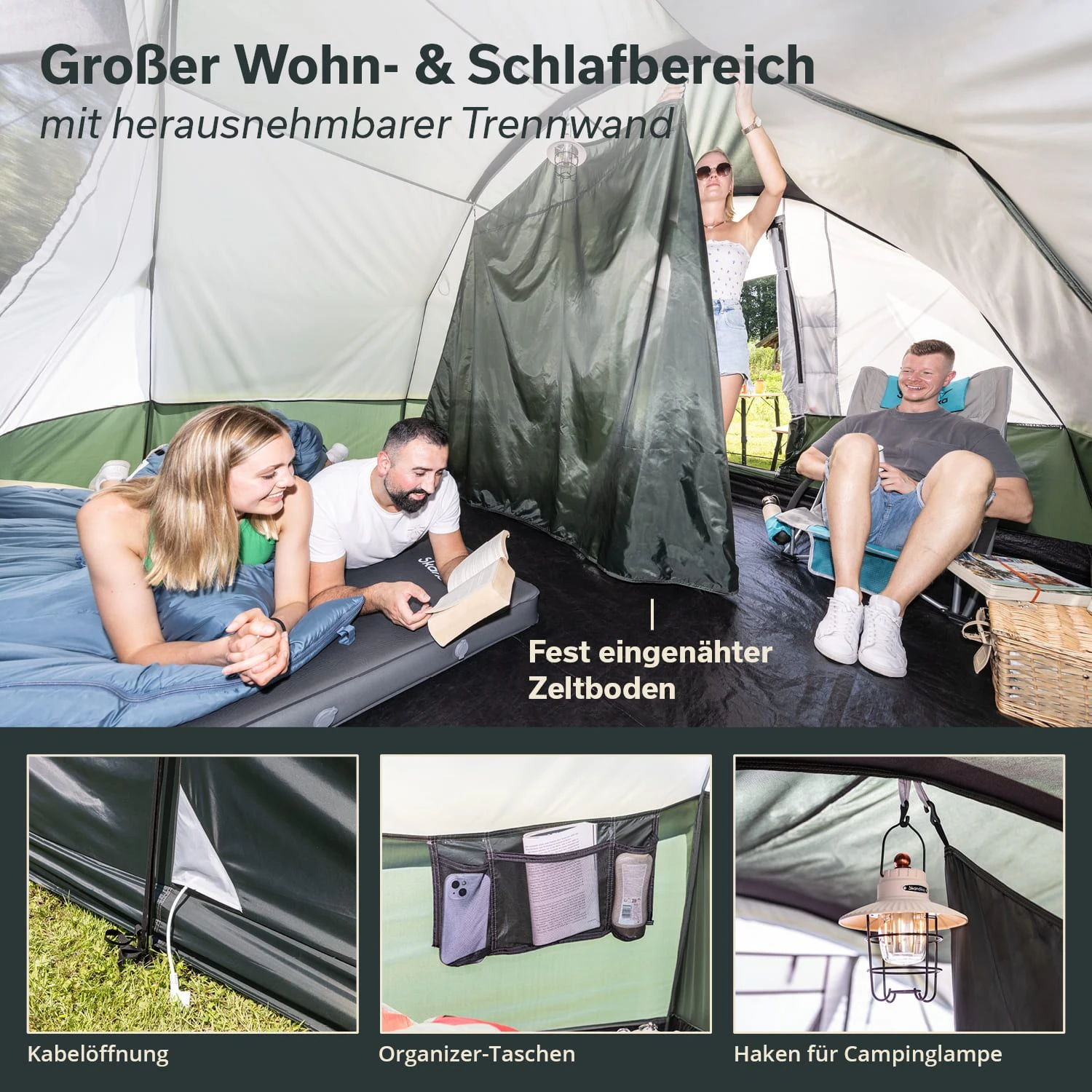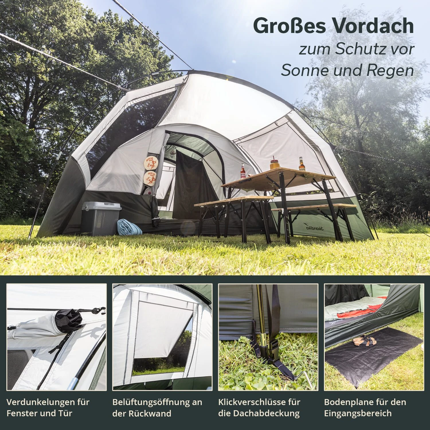 Een van de absolute hoogtepunten van deze tent is het grote panoramadak dat zich over de binnenruimte uitstrekt. Het is gemaakt van canvas en biedt een adembenemend uitzicht op de hemel. Frisse lucht, veel licht en ’s nachts een helder zicht op de sterren – het gevoel buiten in de natuur te zijn, bijna onder de open hemel, is echt uniek.