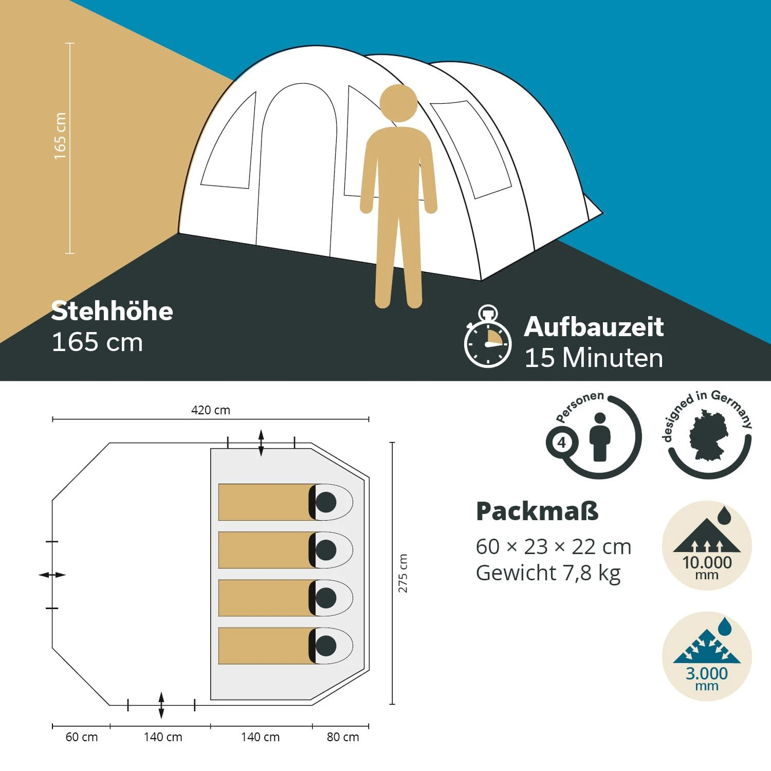 De combinatie van stevige maar flexibele glasfiberstokken, scheurvast, waterdicht buitenmateriaal en het eenvoudig opzetten van deze praktische tent maakt de Kambo 4 veelzijdig, of het nu is als populaire metgezel voor gezinnen die het graag ongecompliceerd houden of voor een groep vrienden die samen naar het volgende muziekfestival willen. In de gezellige slaapcabine met extra directe toegang van buitenaf is er genoeg ruimte voor een comfortabele nachtrust.