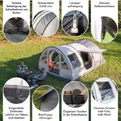 Deze ruime tent biedt meer dan 16 m² met een ingenaaide tentvloer en een comfortabele stahoogte van 205 cm. Dit zorgt voor fantastische outdooravonturen voor gezinnen en vrienden die hun vakantieverblijf snel en gemakkelijk willen opzetten.
