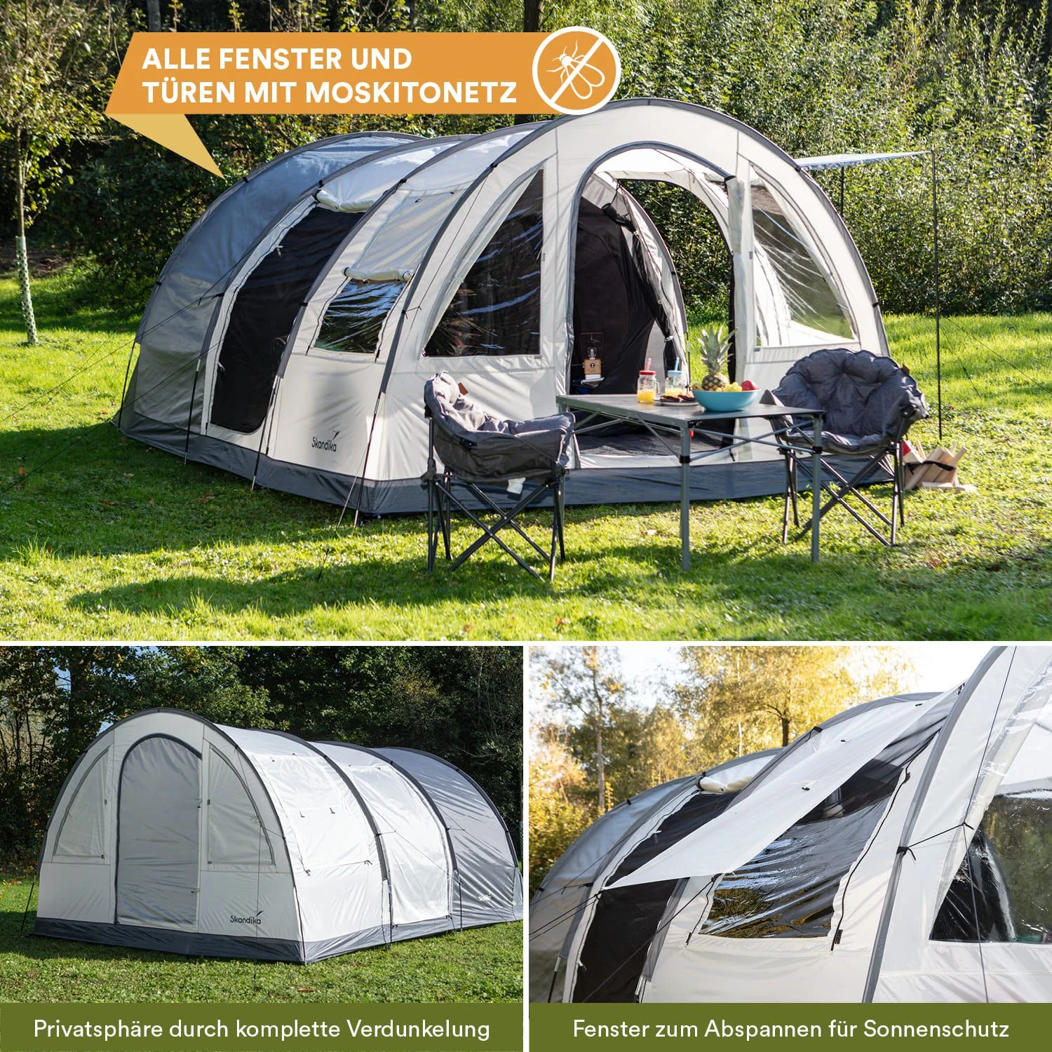 Met zijn tunnelvorm is de Skandika Simo 5 snel en eenvoudig op te zetten, waardoor hij de perfecte aanvulling is voor gezinnen en vrienden op de camping of een festival, en ook een heerlijk vakantiegevoel geeft als je in de tuin verblijft!