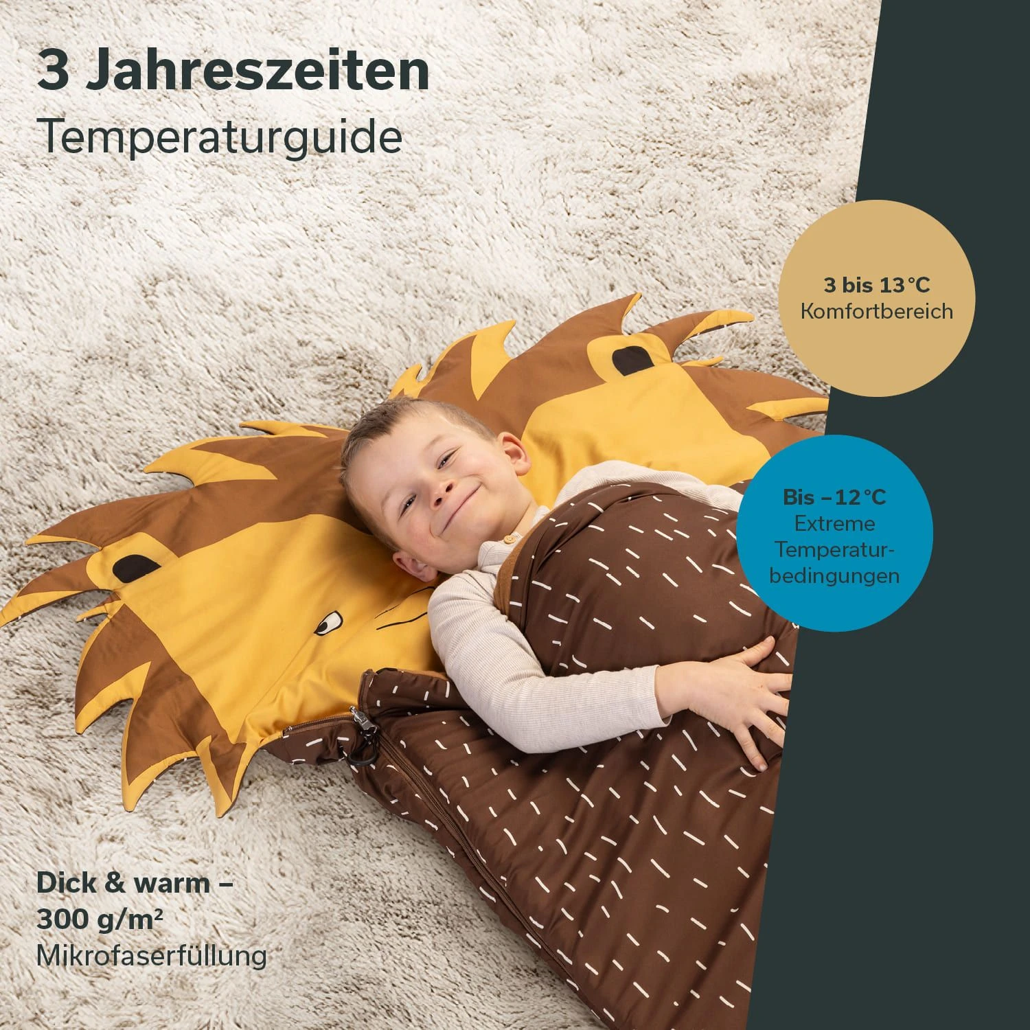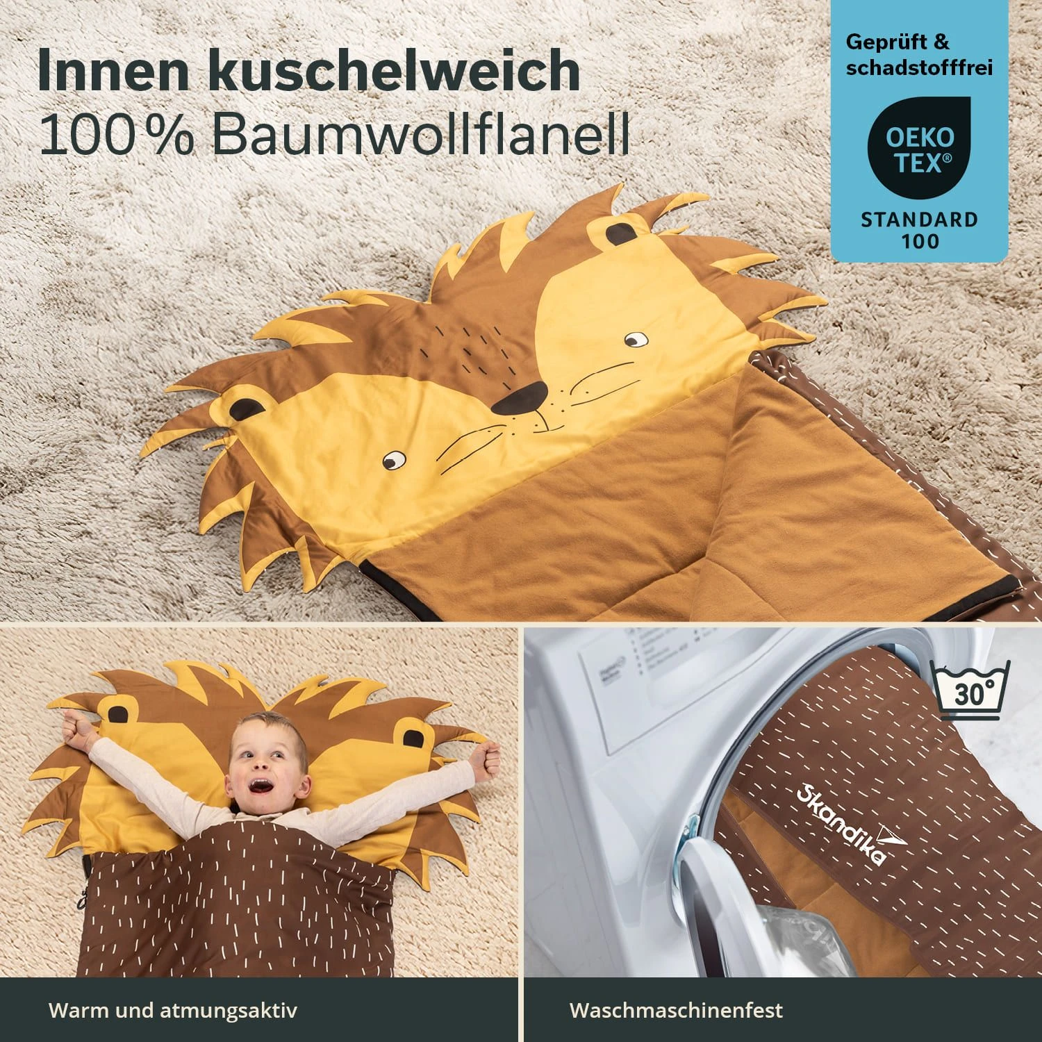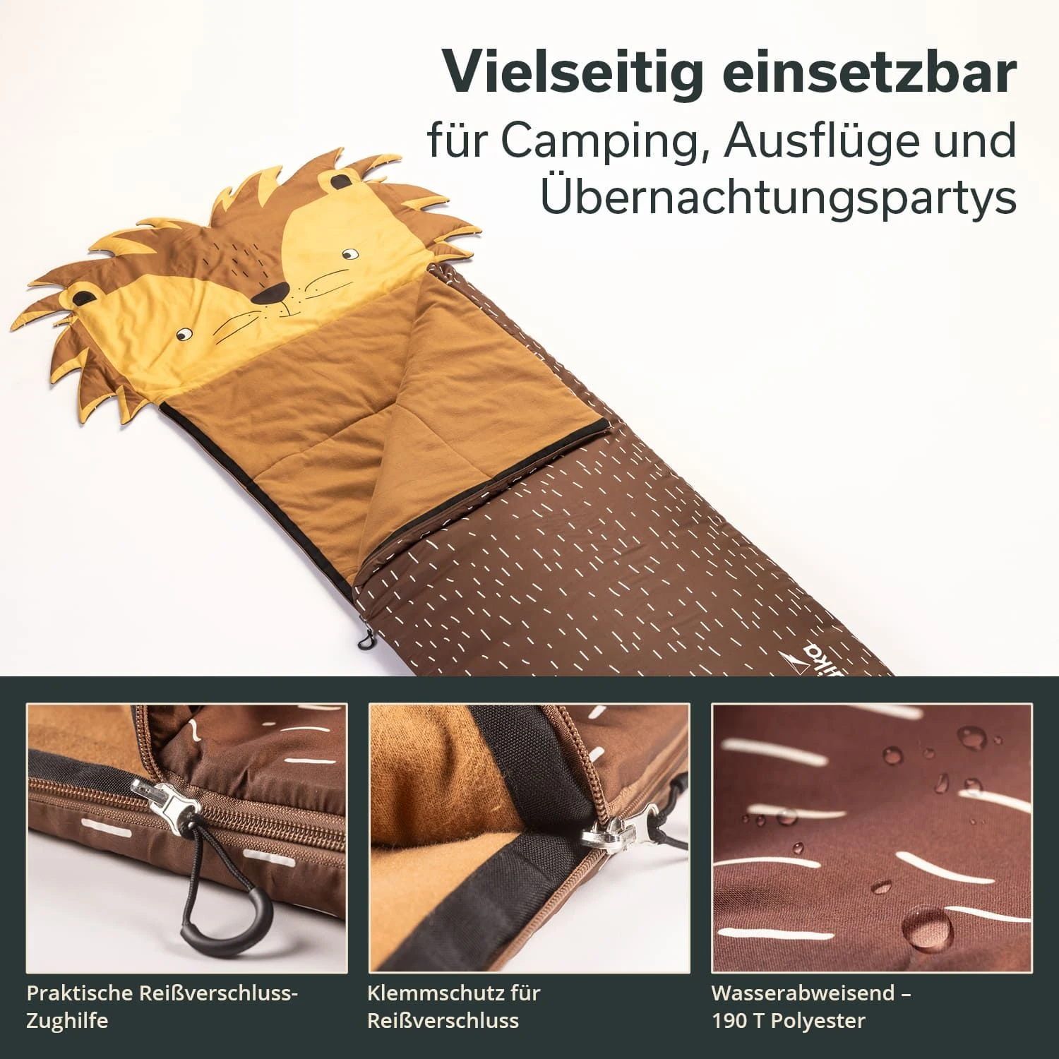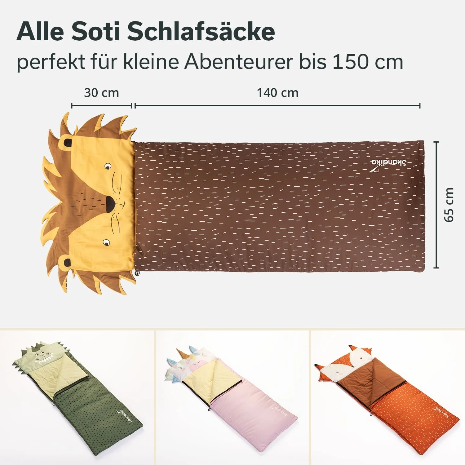 De kleurrijke slaapzakken zijn bijzonder opvallend met hun grote capuchon met een schattig dierenhoofd. Geen saaie monochrome ontwerpen meer! Met de Soti’s van Skandika helpen de leeuw, dinosaurus, eenhoorn en vos om angst in het donker te verdrijven en voor veel plezier te zorgen.