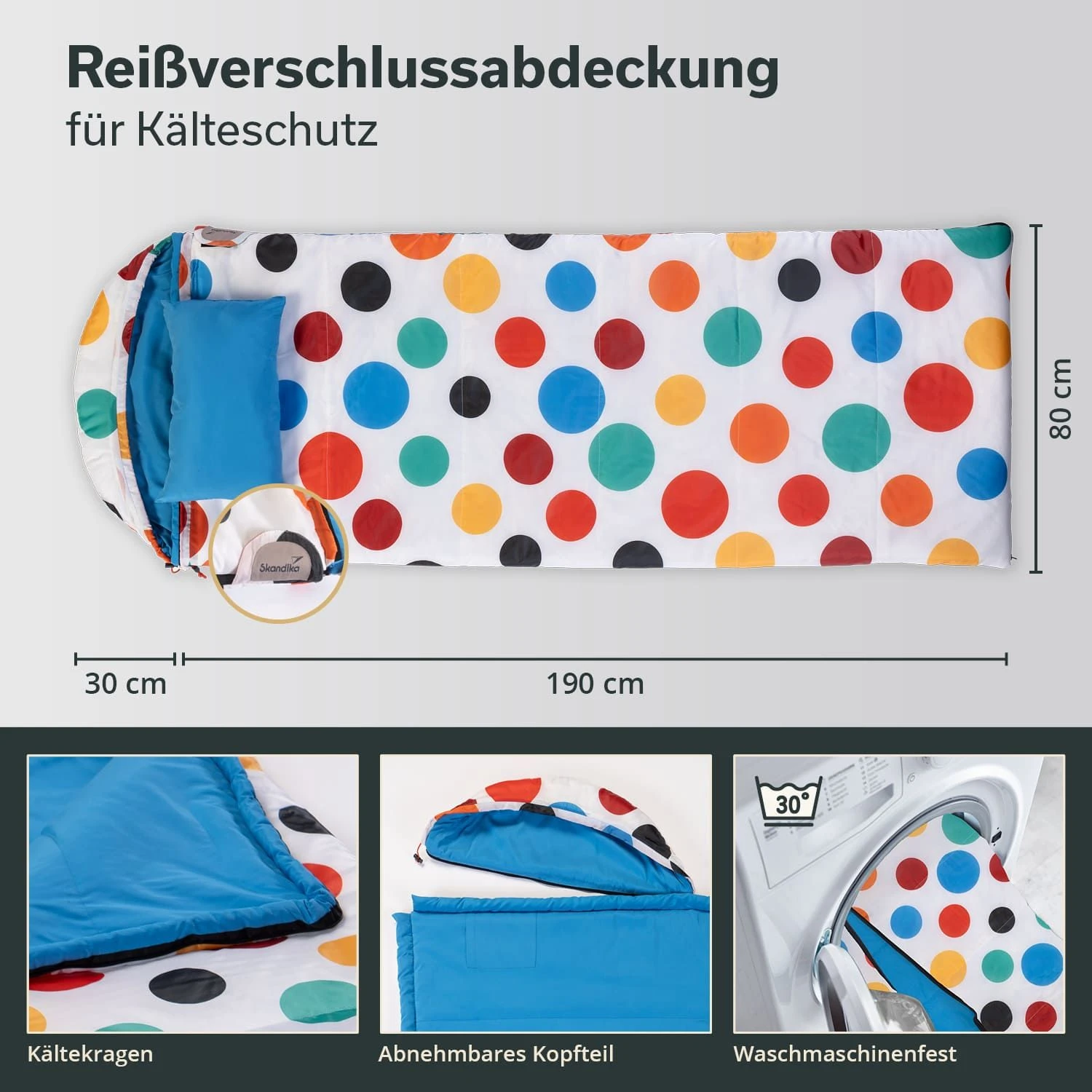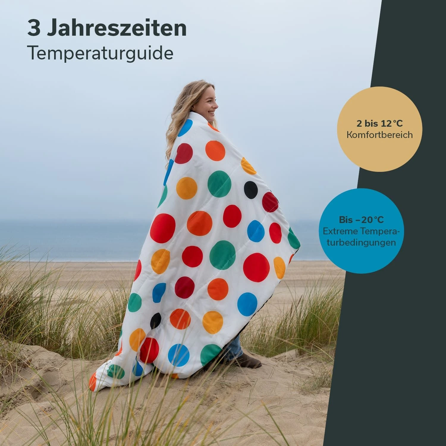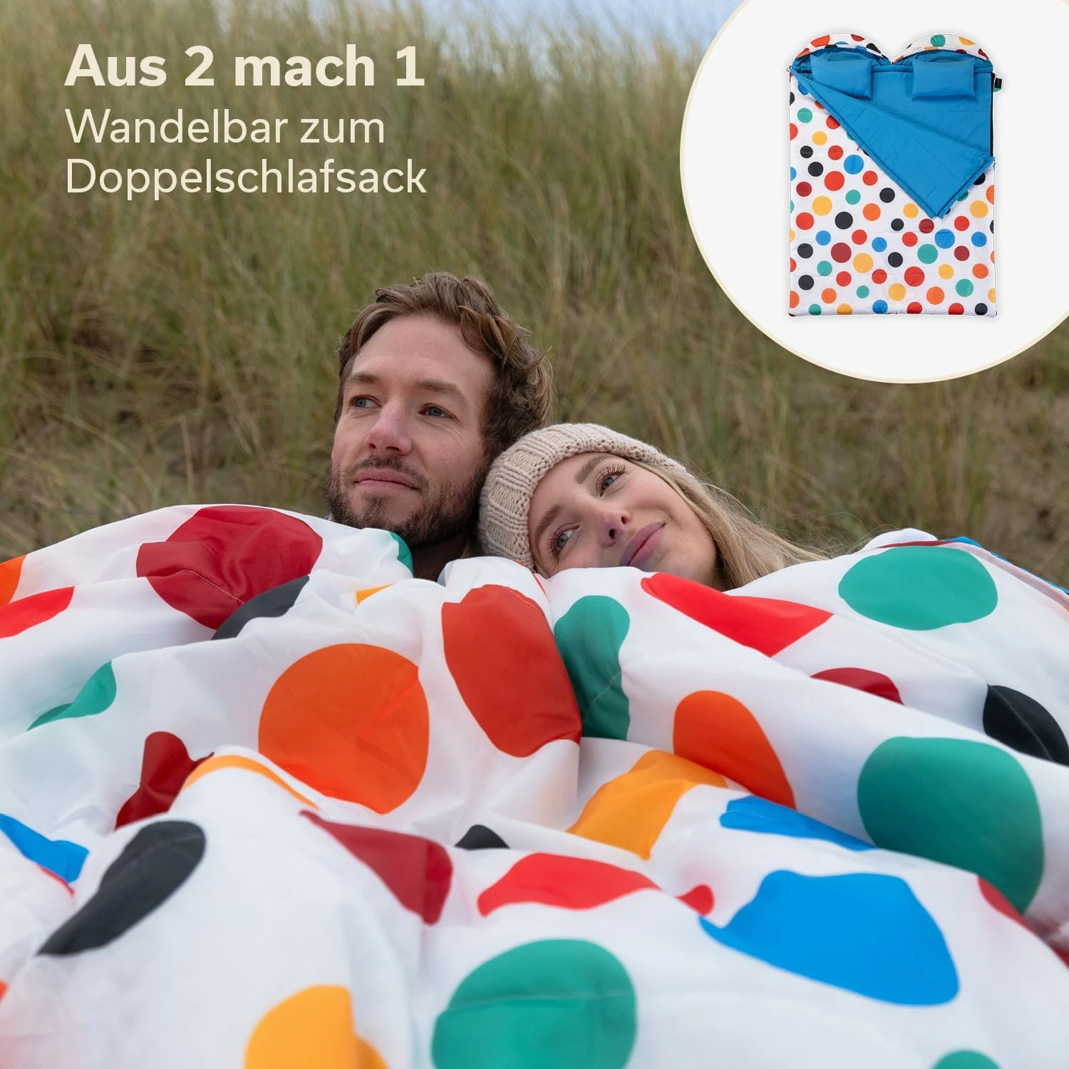 Helemaal open kunnen de Sovro’s worden omgetoverd tot een praktisch picknickkleed of een knusse sprei voor kille avonden – en ze brengen vrolijkheid in elke omgeving met hun vrolijke, kleurrijke ontwerpen. De capuchon kan in een handomdraai worden losgemaakt dankzij de ritssluiting. Bovendien kunnen twee slaapzakken worden uitgeklapt tot een knus tweepersoonsbed. Gewoon neerleggen, opstapelen en opvouwen – en de dubbele slaapzak is klaar! Wanneer de twee afzonderlijke capuchons aan de onderste slaapzak worden bevestigd, blijft het zachte deel van de capuchon voor beide behouden.