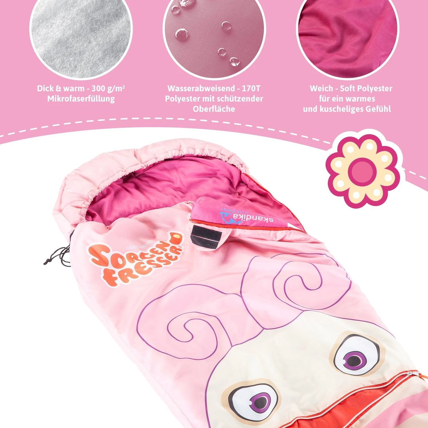 Buitenmateriaal: waterafstotend polyester 170 T. Vulling: 300 g/m² geweven microvezel. Binnenvoering: Behaaglijk zacht polyester. Een functionele, knusse en mooi vormgegeven slaapzak die kinderharten sneller doet kloppen.