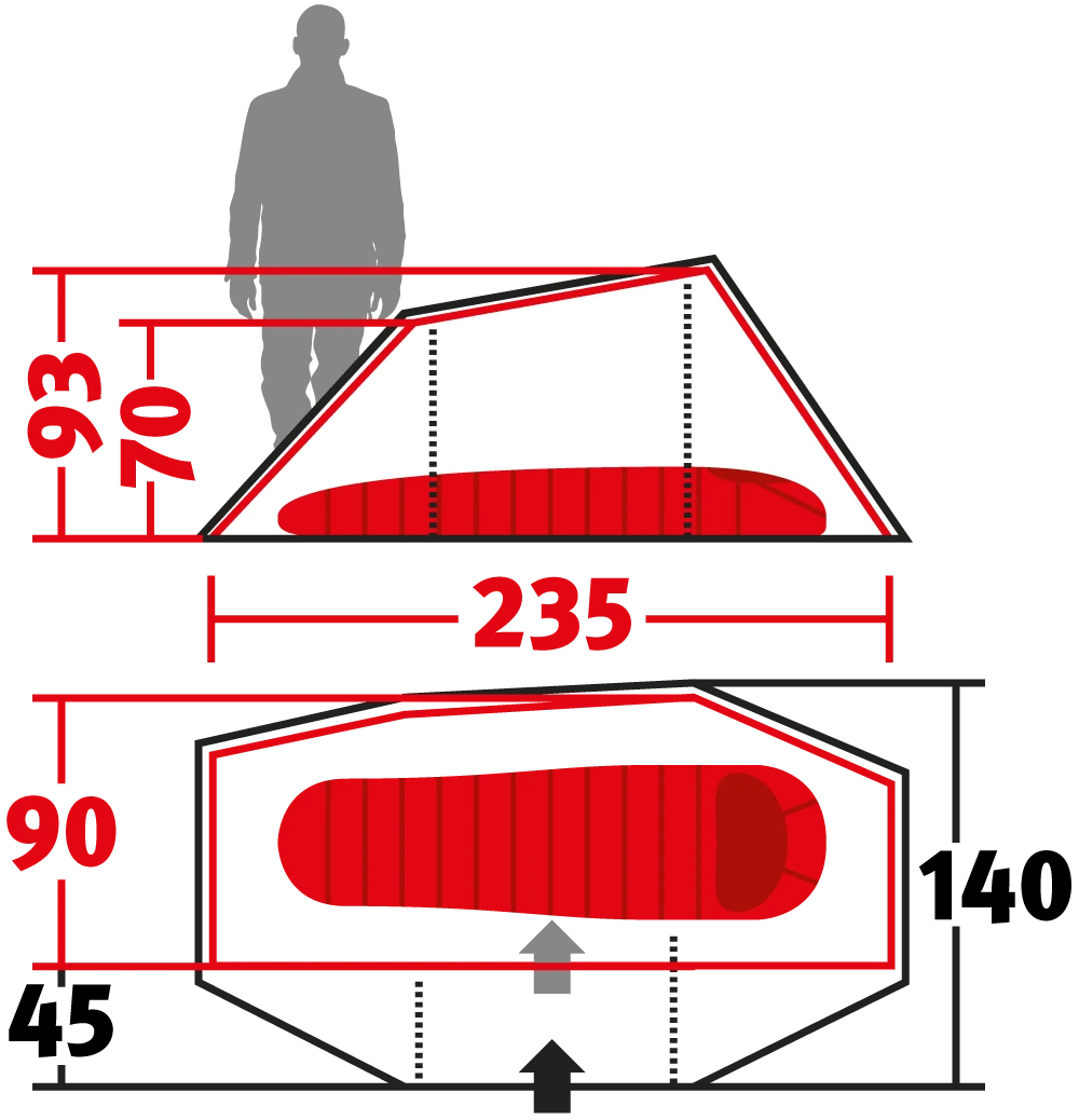 De buitentent is voorzien van vier afsluitbare apex-ventilatiekleppen. De deur van de buitentent kan open worden gezet met extra stokken, waardoor uitstekende bescherming tegen regen wordt geboden. De binnentent biedt een comfortabele zithoogte van 93 cm en genoeg ruimte aan de zijkant voor bagage. Daarnaast beschikt de binnentent over twee afdekbare ventilatieopeningen en een zakje voor het opbergen van kleine spullen. De bovenste helft van de D-vormige deur van de binnentent is gemaakt van niet-afsluitbaar muskietengaas.