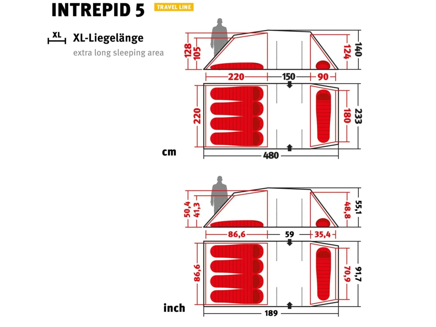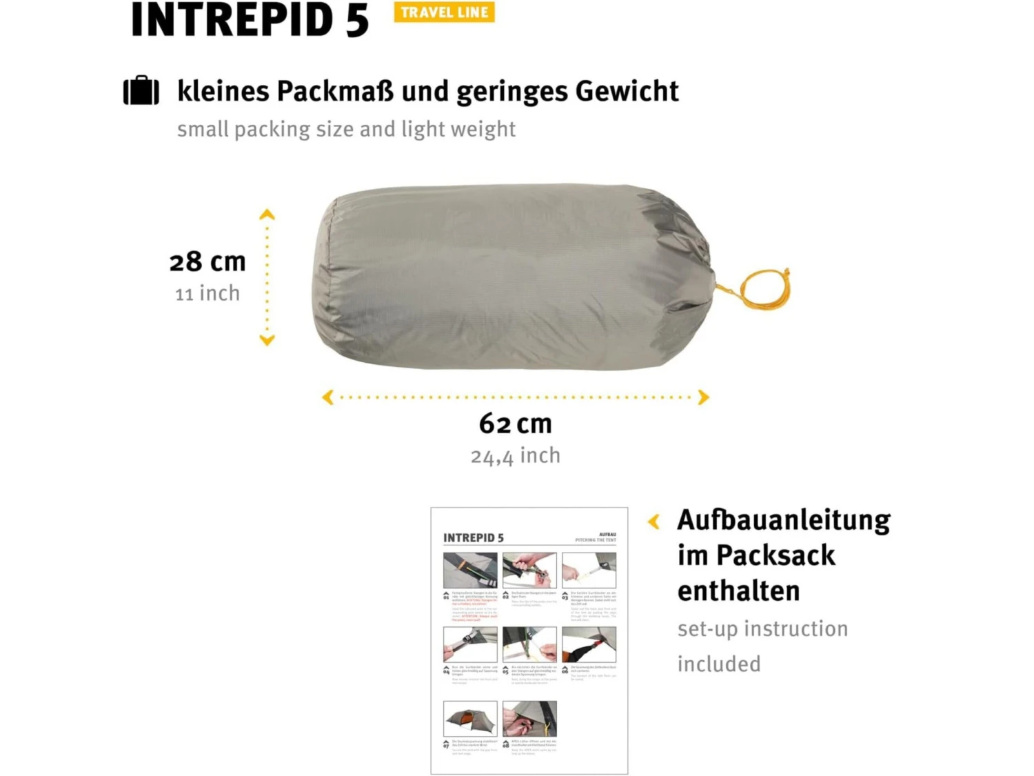 De Intrepid 5 is een tent voor maximaal vijf personen met twee regenbestendige ingangen en een grote voortent. Het heeft drie doorlopende, vlakke externe kanalen. Deze zijn gemakkelijk te hanteren, bieden weinig luchtweerstand en minimaliseren daardoor windgeruis. De extra slaapcabine heeft voldoende bedlengte voor één persoon. Door de beugelhouderconstructie ontstaat er meer ruimte in de cabine, waardoor de gehele cabine optimaal benut kan worden. De slaapcabine kan in gemonteerde toestand in- of uitgehangen worden, zodat de apsis naar wens vergroot kan worden. Het bovenste derde deel van de D-vormige ingang van de binnentent is gemaakt van klamboe. Dankzij de zakken in de binnentent en het muskietennet heeft u snel toegang tot kleine spullen die u snel nodig hebt. De Intrepid 5 heeft twee zij-ingangen die uitstekende bescherming bieden tegen weer en wind wanneer de zijdeuren gesloten zijn. De vier Apex-ventilatieopeningen in de buitentent zorgen voor optimale ventilatie. De tent heeft een aerodynamisch gunstige vorm en is daardoor zeer windstabiel.