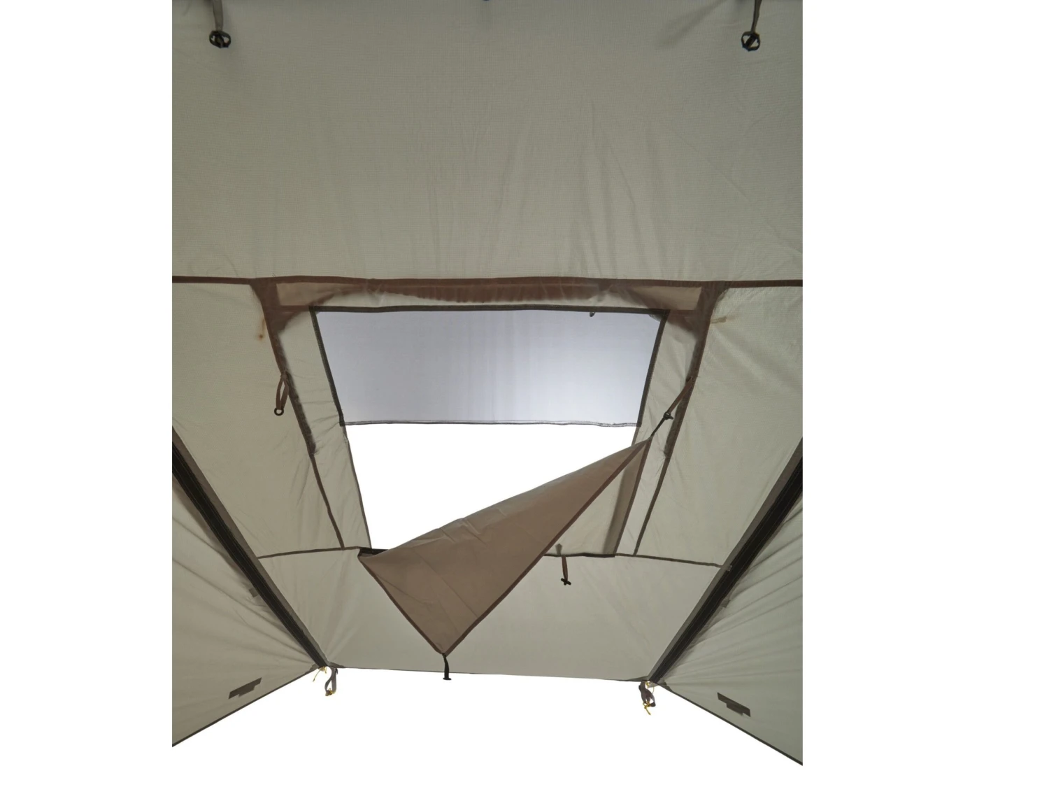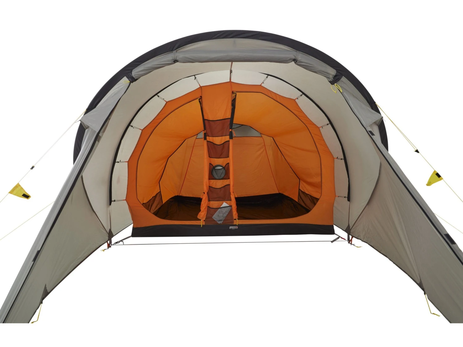 Ondanks het compacte formaat heeft de Voyager een stahoogte van 1,80 m, wat een comfortabele hoofdruimte in de tent garandeert. In de apsis is voldoende ruimte voor een kampeertafel en vier stoelen, zodat u er ook bij regen aangenaam kunt verblijven. In de apsis bevinden zich drie grote regenbestendige PU-ramen, die van binnenuit met een privacyscherm kunnen worden afgedekt. Kenmerkend voor een tunneltent van dit type is de eenvoudige en snelle montage. De tentbogen en de bijbehorende kanalen zijn kleurgecodeerd, zodat u ze tijdens de montage gemakkelijker op de juiste plaats kunt zetten. De Voyager is eenvoudig te monteren, zelfs door één persoon. De entree kan nog verder worden uitgebreid met de Voyager Wing, die als accessoire verkrijgbaar is. Deze Voyager Wing wordt met drie gespen aan het voorste hengelkanaal bevestigd en wordt met een strik aan de voorkant opgezet. Hierdoor wordt de voorruimte aanzienlijk vergroot. De Voyager is de ideale tent voor kleine gezinnen die geen grote en zware tent willen dragen en opzetten, maar toch het comfort van een familietent willen behouden. De binnentent is breed genoeg voor vier slaapmatten (bijv. 2 X Teron M en 2 X Teron L, of 3 X Teron XL) en kan met een stoffen paneel in 2/3 van de breedte worden verdeeld als de tent door drie personen wordt gebruikt. Elke hut die zo ontstaat, heeft een eigen ingang. Aan de voorkant van de cabine zitten diverse zakken waarin u veel kleine spullen kunt opbergen. De extra vleugel is verkrijgbaar in onze accessoires.